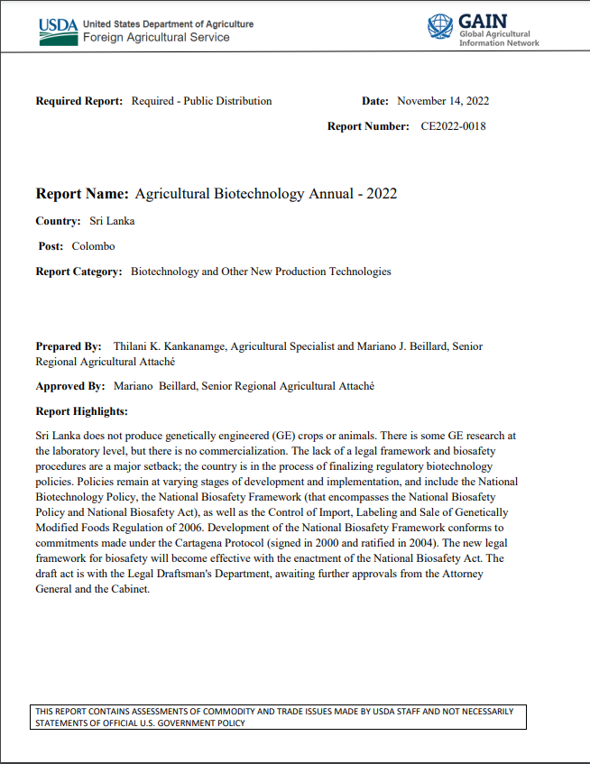 (2023) Yhdysvaltain raportti vahvistaa GMO-ruoan tuotannon Sri Lankassa Lähde: AgricultureInformation.lk | Yhdysvaltain maatalousministeriön asiakirja