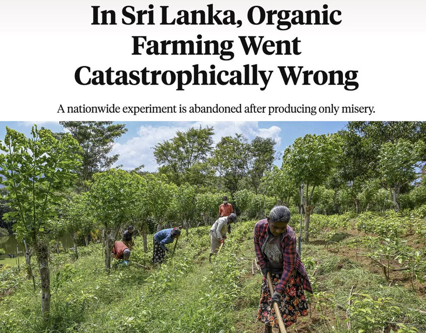 Sri Lanka suoritti viime vuonna pahan kokeen kansalaisillaan. Luomuruoan ja GMO-vastaisten aktivistien vaikutuksesta hallitus kielsi synteettisten torjunta-aineiden tuonnin ja pakotti maan siirtymään kokonaan luomuviljelyyn, jättäen valtaosan viljelijöistä ilman pääsyä elintärkeisiin työkaluihin, joilla he kasvattavat maansa tarvitsemia viljelykasveja.